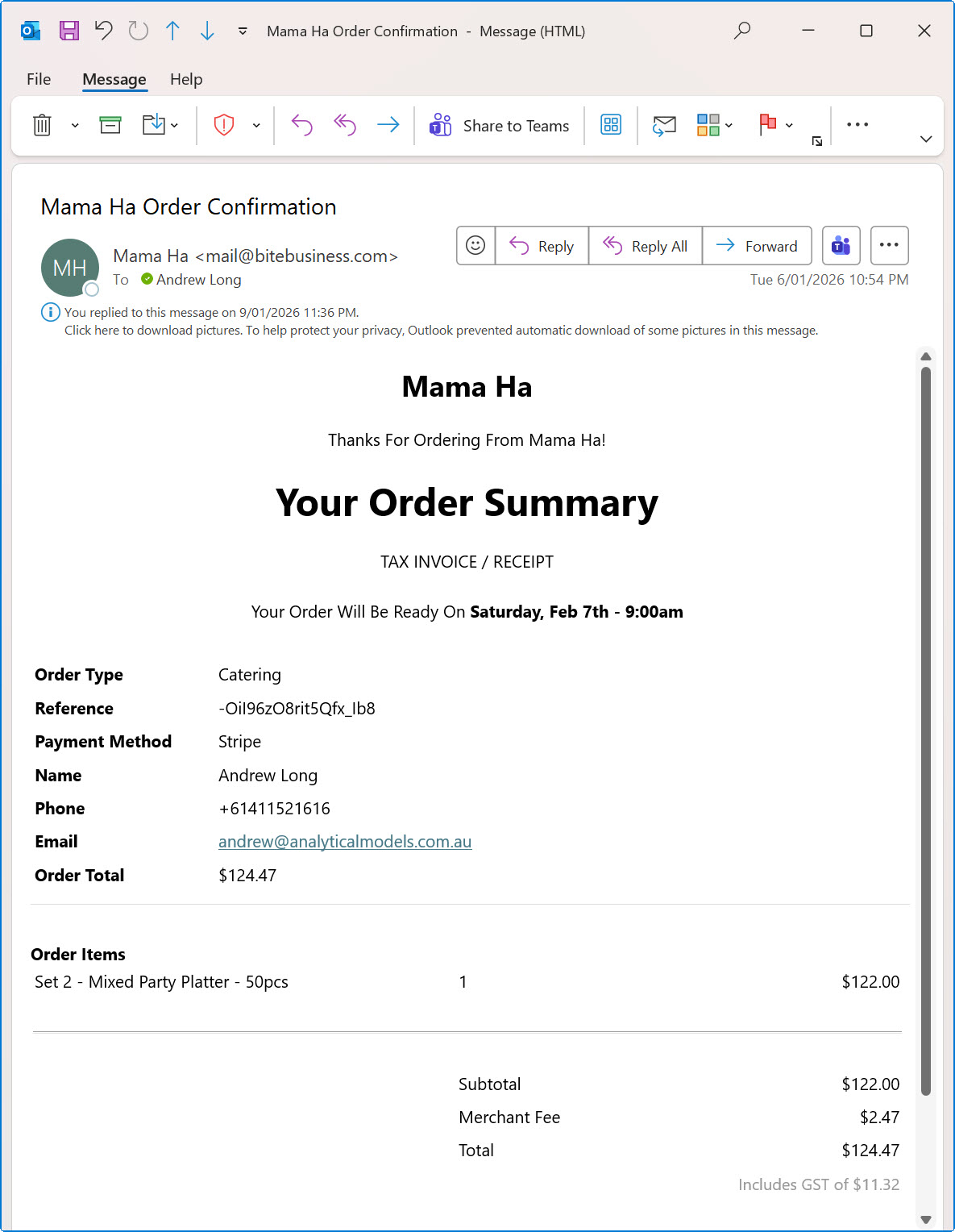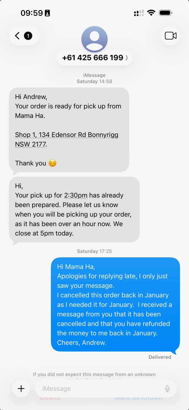2:58 PM: “Your order is ready for pick up from Mama Ha.”